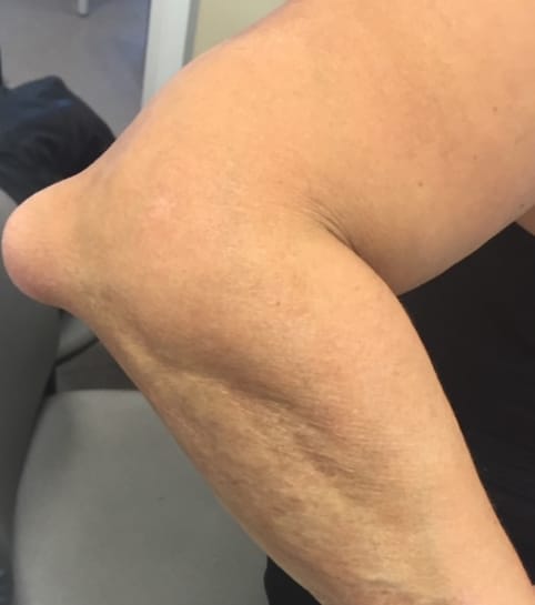 Relativement fréquente, l’hygroma est une tuméfaction caractérisée par l’apparition d’un gonflement situé à l’arrière du coude, au niveau de sa partie proéminente. Il s’agit d’une inflammation de la bourse séreuse, une poche située entre la peau et l’os du coude et qui intervient dans la mobilité articulaire. Lors de l’inflammation, la poche se remplit de liquide synovial. Egalement appelée bursite, cette inflammation apparaît après certains traumatismes ou frottements répétés, parfois associée à de la fièvre.