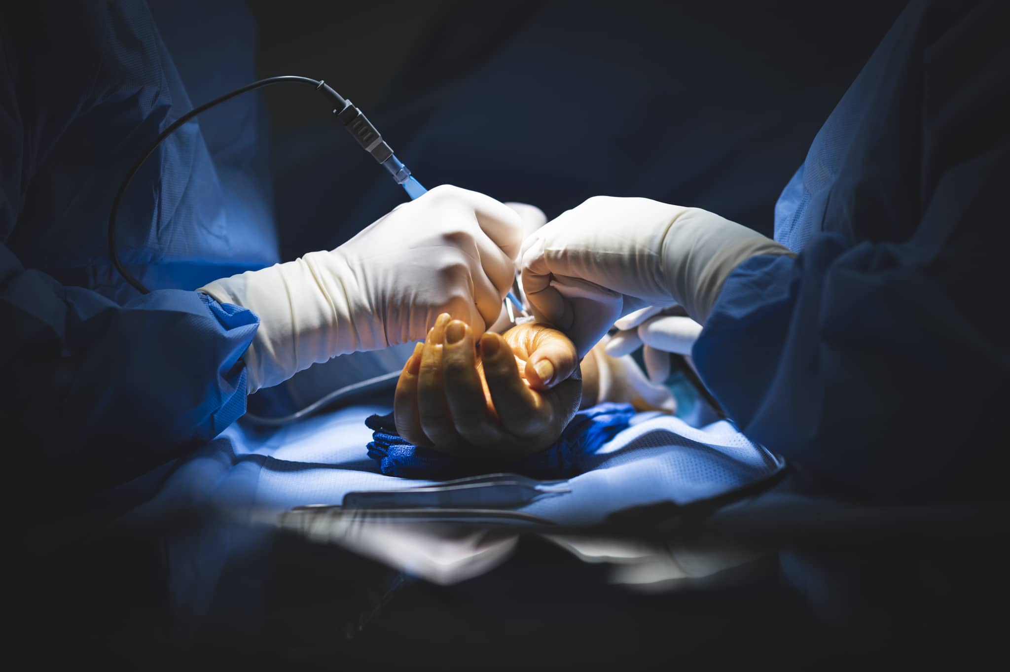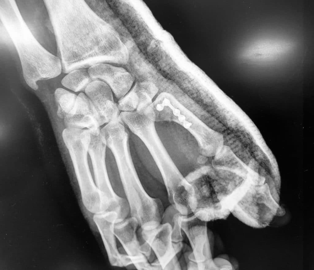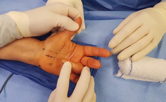 Suites opératoires : Les pansements sont réalisés durant 15 jours, délai au delà duquel la main peut être mouillée. La main peut être utilisée librement dès le lendemain de l’intervention et en fonction de la douleur. Un arrêt de travail est prescrit au cas par cas, dépendant du contexte et de l’emploi.