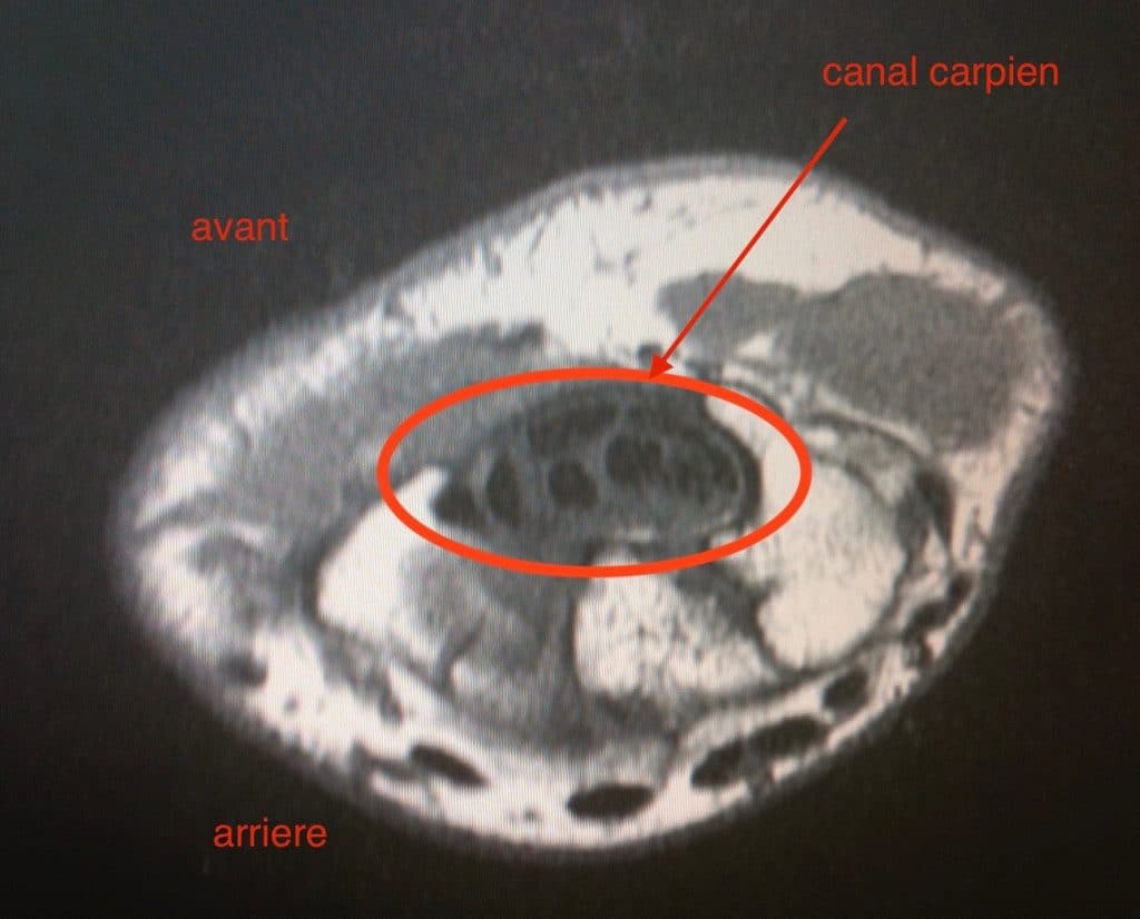 Également appelé syndrome du tunnel carpien, cette pathologie nerveuse est très fréquente, elle se caractérise par une compression du nerf médian dans son canal naturel. Le nerf médian chemine par le canal avec neuf tendons reliés aux doigts. La compression du nerf apparaît avec le temps. Elle est due soit à une rétraction du contenant c'est à dire l’espace délimitant le canal soit à une augmentation du contenu c’est à dire les tendons.