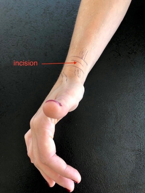 Intervention réalisée sous anesthésie locale et en ambulatoire. Elle consiste en une courte incision au niveau du poignet.