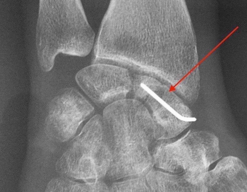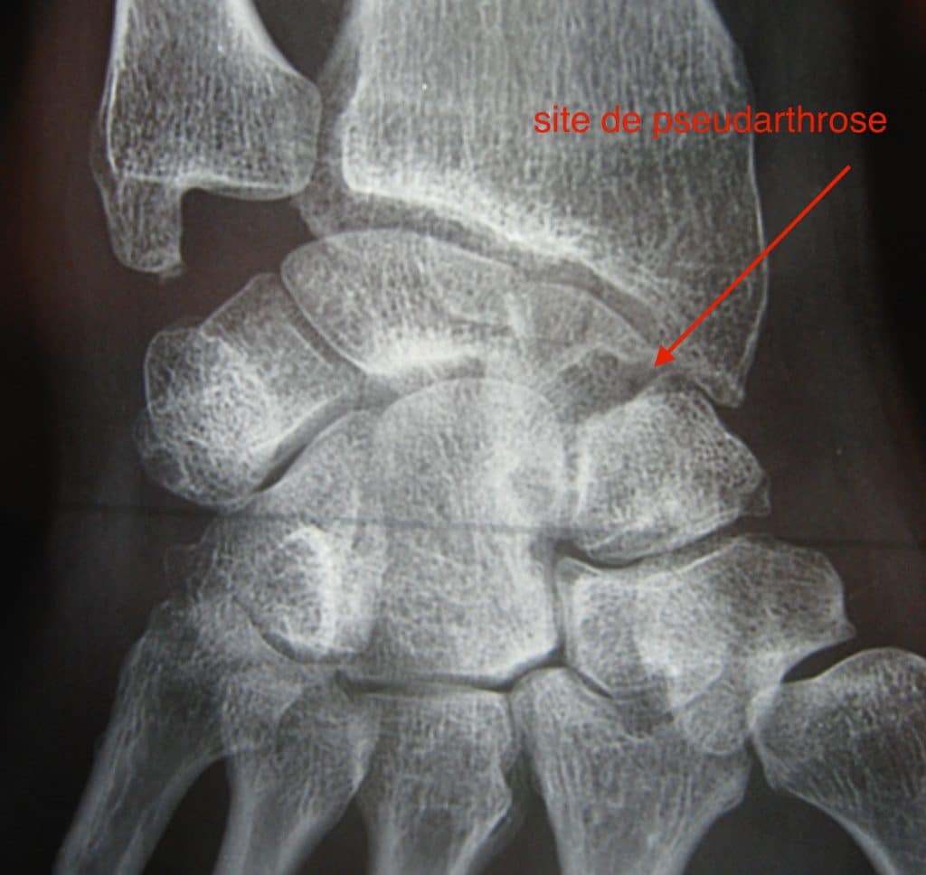 Suite à une fracture du poignet, du fait de sa vascularisation particulière, si la fusion des pièces osseuses ne se fait pas, on parle de pseudarthrose du scaphoïde. Il s’agit d’une absence de consolidation des deux morceaux du scaphoïde Au-delà des délais habituels (6 mois), douleur et parfois gonflement du poignet invitent à un bilan radiographique, afin d’établir le diagnostic. Lorsqu’il est confirmé, un scanner et une IRM sont nécessaires afin d’établir le stade selon de l’affection et l’état de vascularisation de la partie haute du scaphoïde.